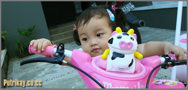 Warna sepedanya Pink, ada sebuah tombol berbentuk sapi yang kalo di pencet terdapat suara sapinya mooo mooo mooo ting tang ting ting ... ada musiknya juga. Kayla sangat suka selaki, rasanya pengen cepet besar aja Kayla ... pasti lucu sekali kalau Kayla sudah bisa mengendarainya sendiri ...